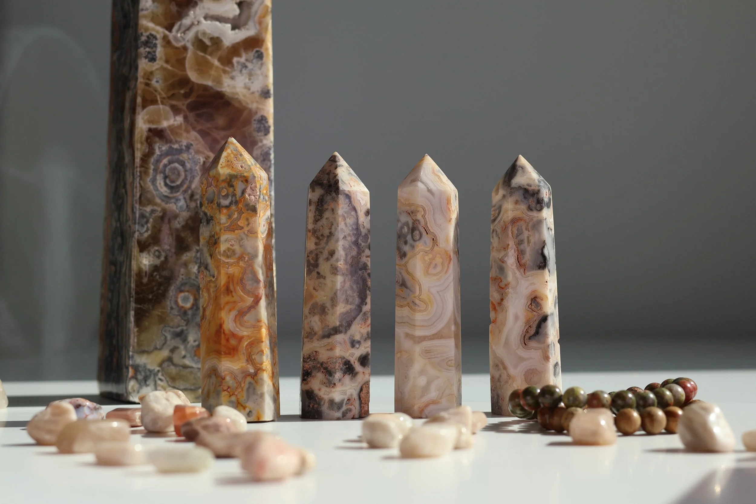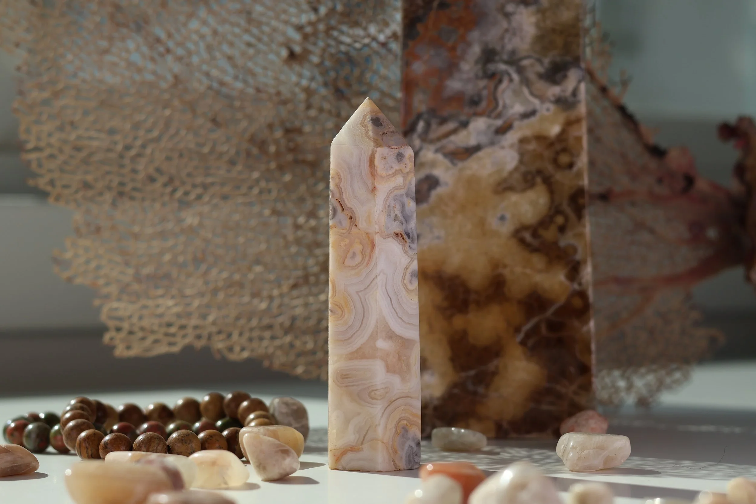 Crazy Lace Agate is a striking and vibrant stone renowned for its captivating colors which range from warm yellows and deep reds to rich browns, creating intricate, lace-like patterns that draw the eye and bring warmth to any space. These dynamic hues not only make Crazy Lace Agate a beautiful addition for decor but also symbolize the stone's deep spiritual significance.