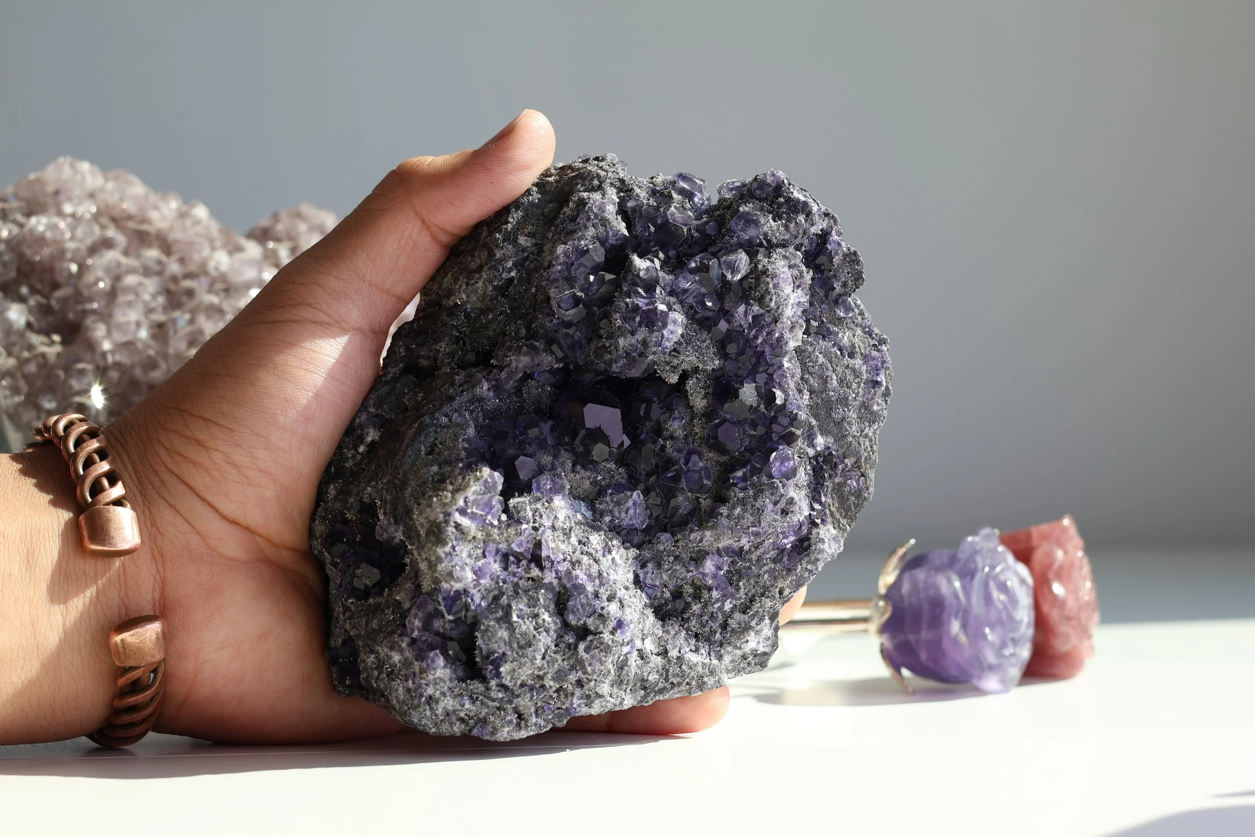 This crystal is a fascinating combination of tanzanite fluorite, quartz and subtle hints of pyrite, adding to its unique structure and aesthetic charm. The quartz enhances its clarity and energetic properties, while the pyrite lends an additional layer of intrigue and vibrancy.